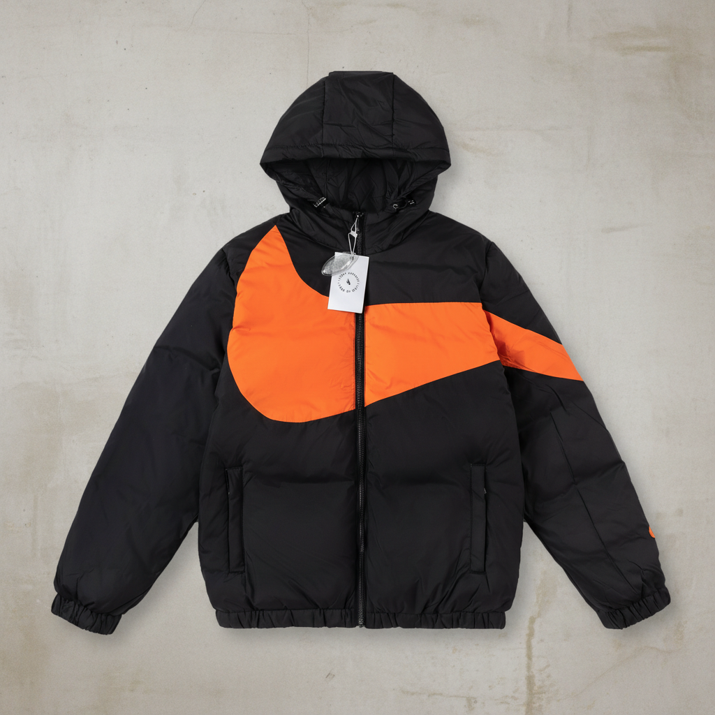Nike Men’s Black Orange Puffer Jacket with Hood, Warm Winter Coat, Lightweight Outdoor Sportswear, Stylish Streetwear, Full Zip Closure