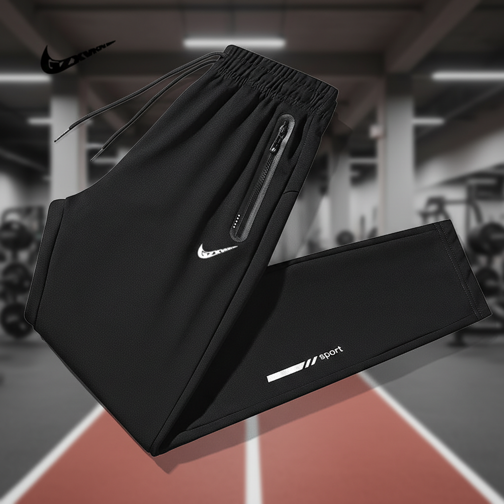 Nike men’s black sport pants with zip pocket, elastic waist, drawstring, breathable fabric, perfect for running, training, gym, and casual wear.
