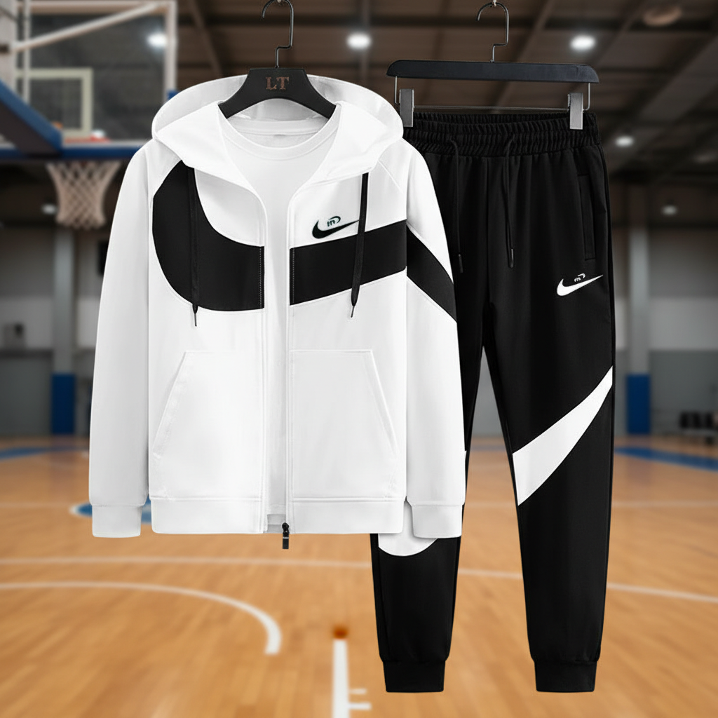 Nike Men’s Hoodie and Joggers Set, stylish black and white sportswear, perfect for casual wear, training, and street fashion, comfortable fit with modern design.