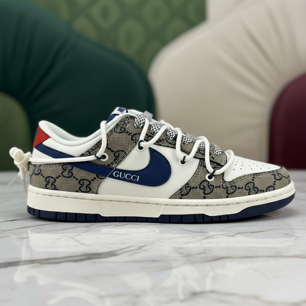 Nike Gucci low-top sneakers with signature monogram canvas, premium leather, blue swoosh, and durable rubber sole, perfect for fashion-forward streetwear style.