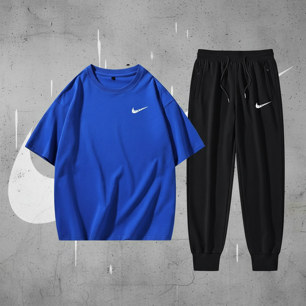 Nike casual sportswear set with blue short-sleeve t-shirt and black jogger pants, breathable cotton fabric, perfect for training, running, or everyday streetwear fashion.