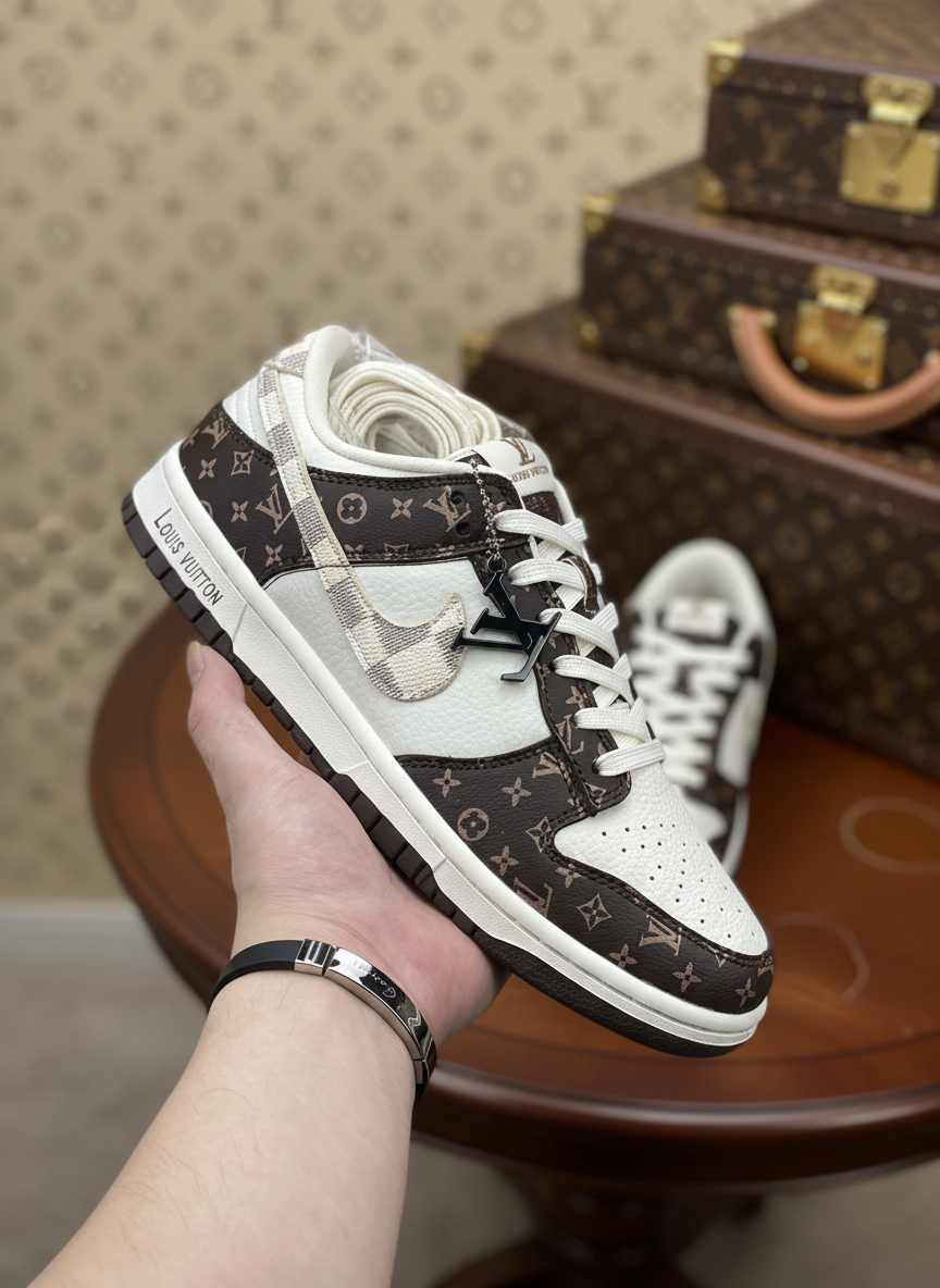 Nike Louis Vuitton Dunk Low Sneakers, premium leather, classic monogram pattern, stylish design, comfortable fit, perfect for casual wear and street fashion.