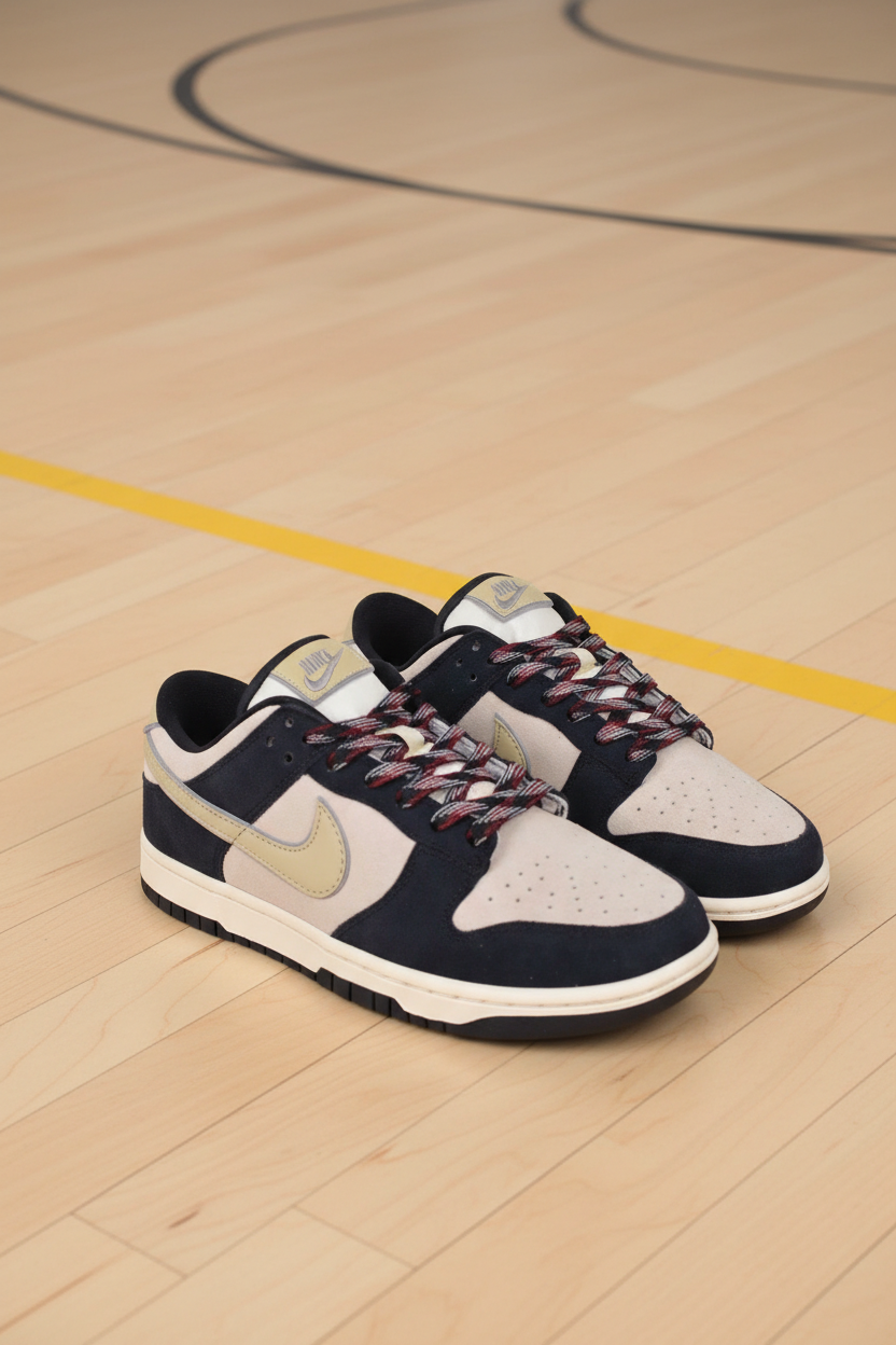 Nike Dunk Low sneakers in beige and black with durable suede, stylish contrast laces, and classic Swoosh design for everyday comfort and streetwear fashion.