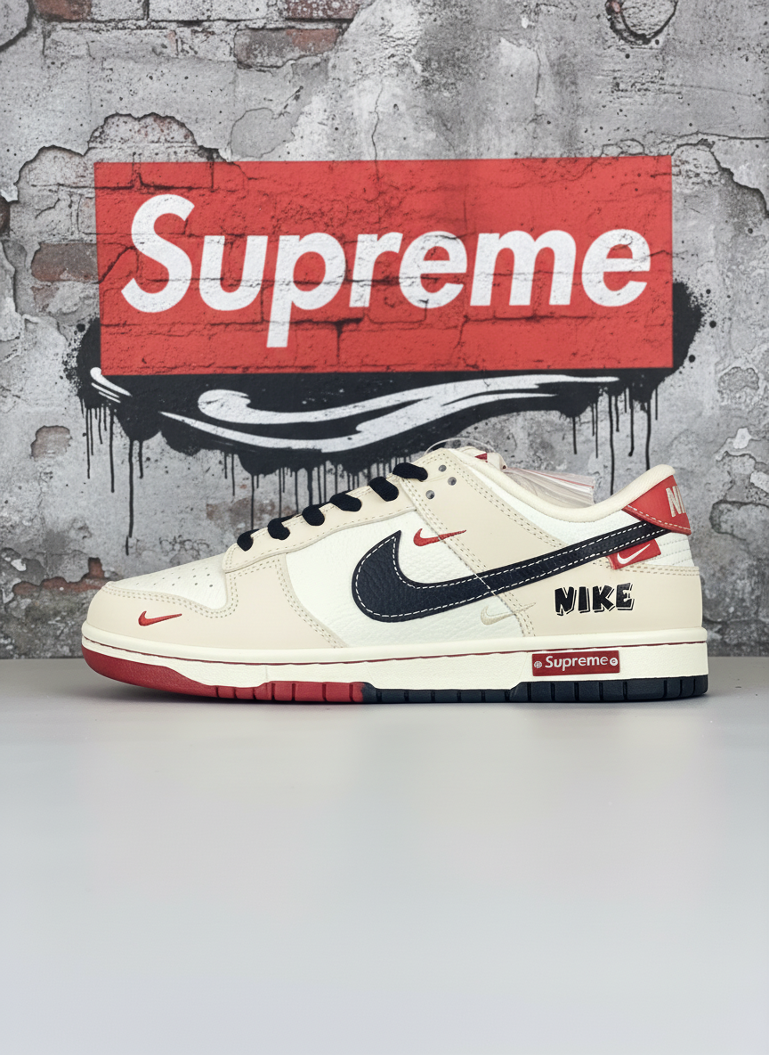 Nike Supreme Dunk Low sneakers, premium leather, beige with black swoosh, red accents, stylish design, durable sole, perfect for streetwear and casual fashion.