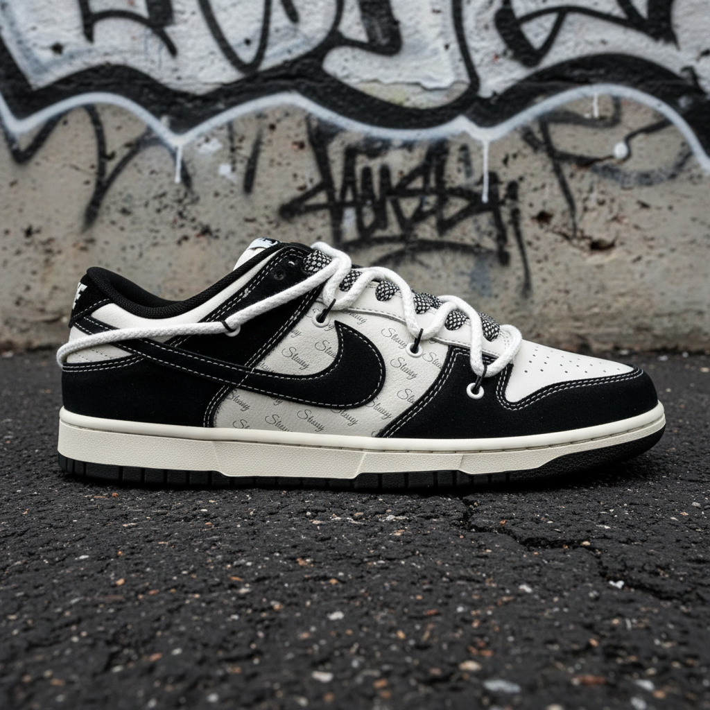 Nike Stussy Dunk Low sneakers featuring black and white leather, signature Swoosh logo, durable rubber sole, and stylish rope laces for a premium streetwear look.