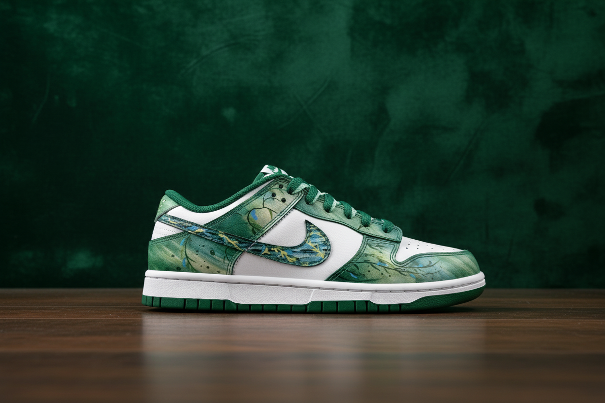Nike Faith Green Floral Low Sneakers, stylish white and green leather design, durable rubber sole, perfect for casual wear and street fashion.