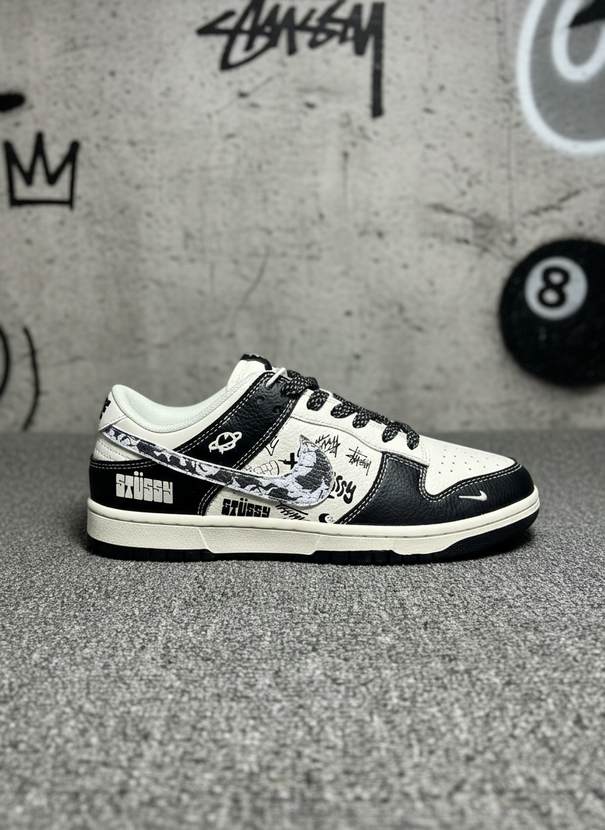 Nike Stüssy limited edition skate shoes, black and white leather sneakers with unique graffiti design, durable sole, and comfortable fit for streetwear and casual style.