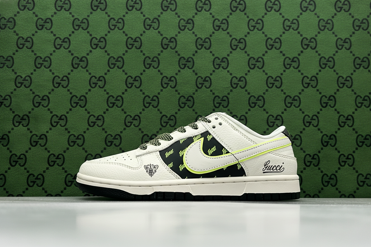 Nike x Gucci Low-Top Sneakers, premium white leather with neon accents, stylish logo print, durable rubber sole, perfect for casual wear and street fashion.