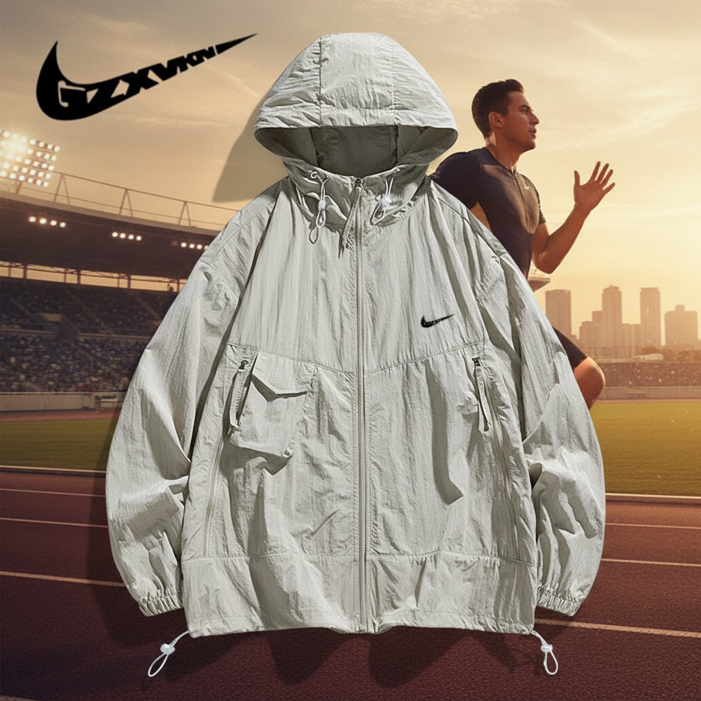 Nike Men’s Lightweight Hooded Windbreaker Jacket, water-resistant, breathable, with front pockets, perfect for outdoor sports, travel, and casual wear.