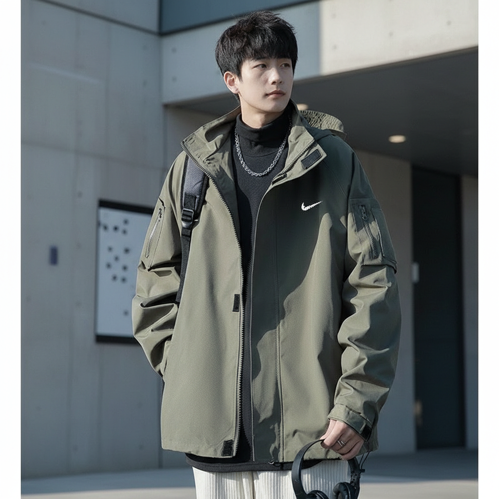 Nike Men’s Outdoor Hooded Jacket, Lightweight Windbreaker, Casual Streetwear Coat for Autumn Winter, Military Green, Stylish and Comfortable for Travel and Daily Wear.