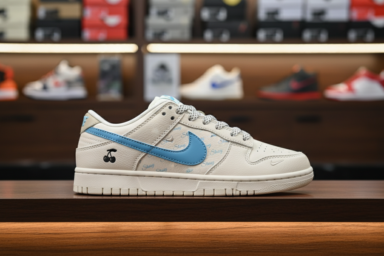 / Nike SB Dunk Low Stussy White Blue Swoosh Leather Shoes