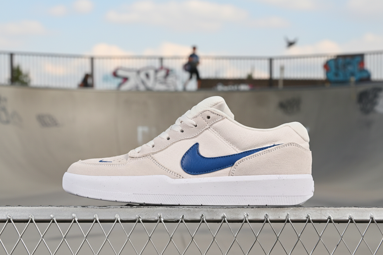 Nike beige suede sneakers with blue Swoosh, low-top design, durable rubber sole, and classic sporty style perfect for casual wear and skateboarding.