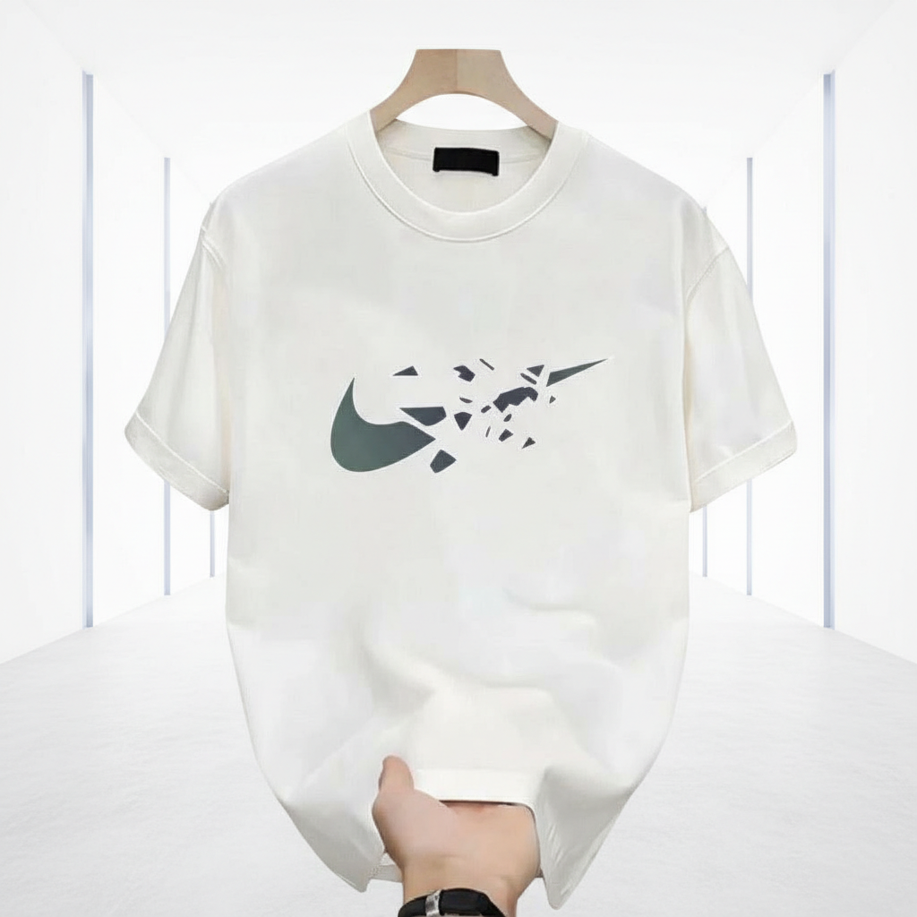 Nike Men’s Casual White T-Shirt with Unique Shattered Swoosh Logo, Soft Cotton Tee for Everyday Streetwear Style