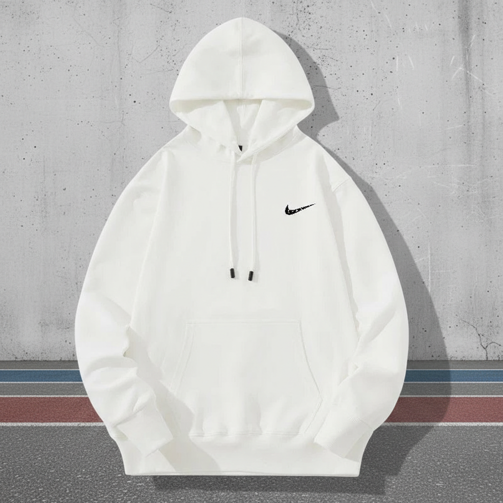 Nike White Hoodie, classic pullover design with adjustable drawstring, soft fleece fabric, front pocket, perfect for casual wear, sports, and street style fashion.