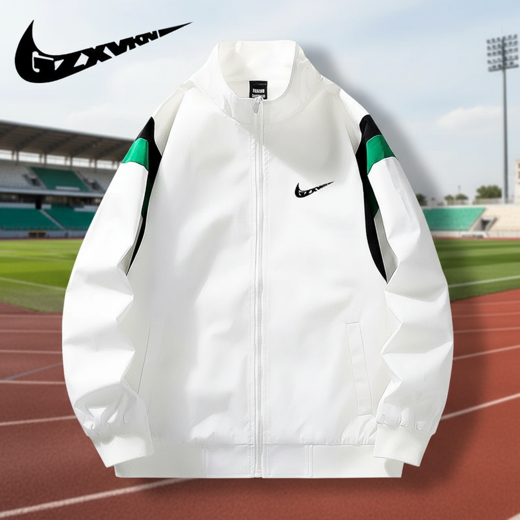 Nike Men’s White Sports Jacket, Lightweight Windbreaker with Green and Black Shoulder Design, Zip Closure, Stylish Outdoor Activewear for Running, Training, and Casual Wear.