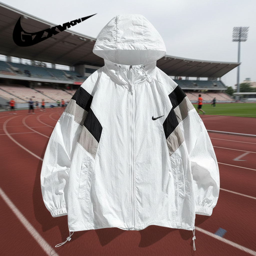 Nike Men’s Lightweight Hooded Windbreaker Jacket, White with Black and Gray Panels, Stylish Sportswear for Outdoor Running, Training, and Casual Wear.