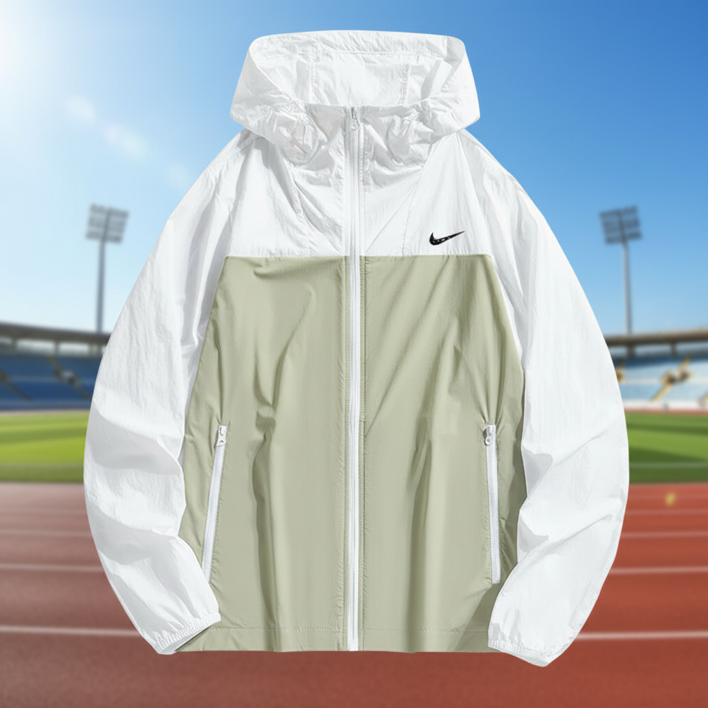 Nike Men’s Lightweight Windbreaker Jacket, Two-Tone White and Khaki, Hooded Design with Zip Pockets, Perfect for Outdoor Sports and Casual Wear