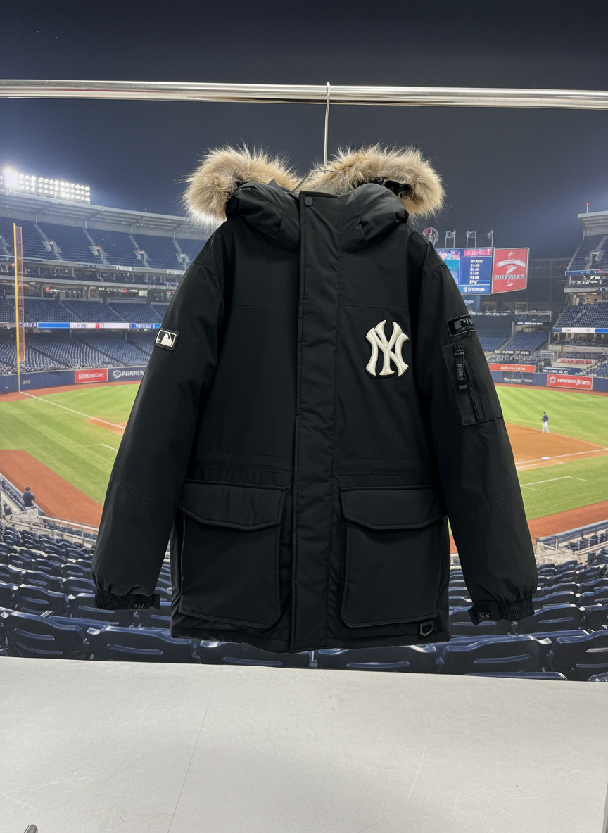 Dior NY Yankees black winter jacket with faux fur hood, warm insulated design, front pockets, and stylish logo patch for trendy cold-weather streetwear.