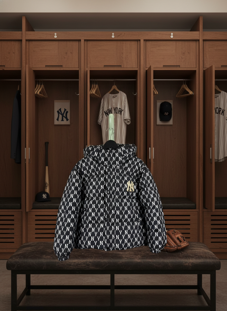 MLB NY Logo Black Puffer Jacket, Warm Winter Hooded Coat with Allover Print, Stylish Lightweight Outerwear for Men and Women