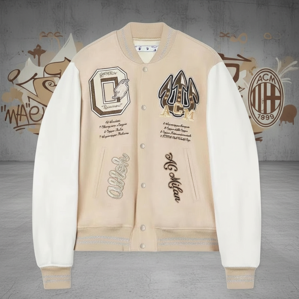 Off-White AC Milan Varsity Jacket, beige and white color block, premium embroidery, streetwear style, unisex fashion, casual outerwear for spring and autumn.