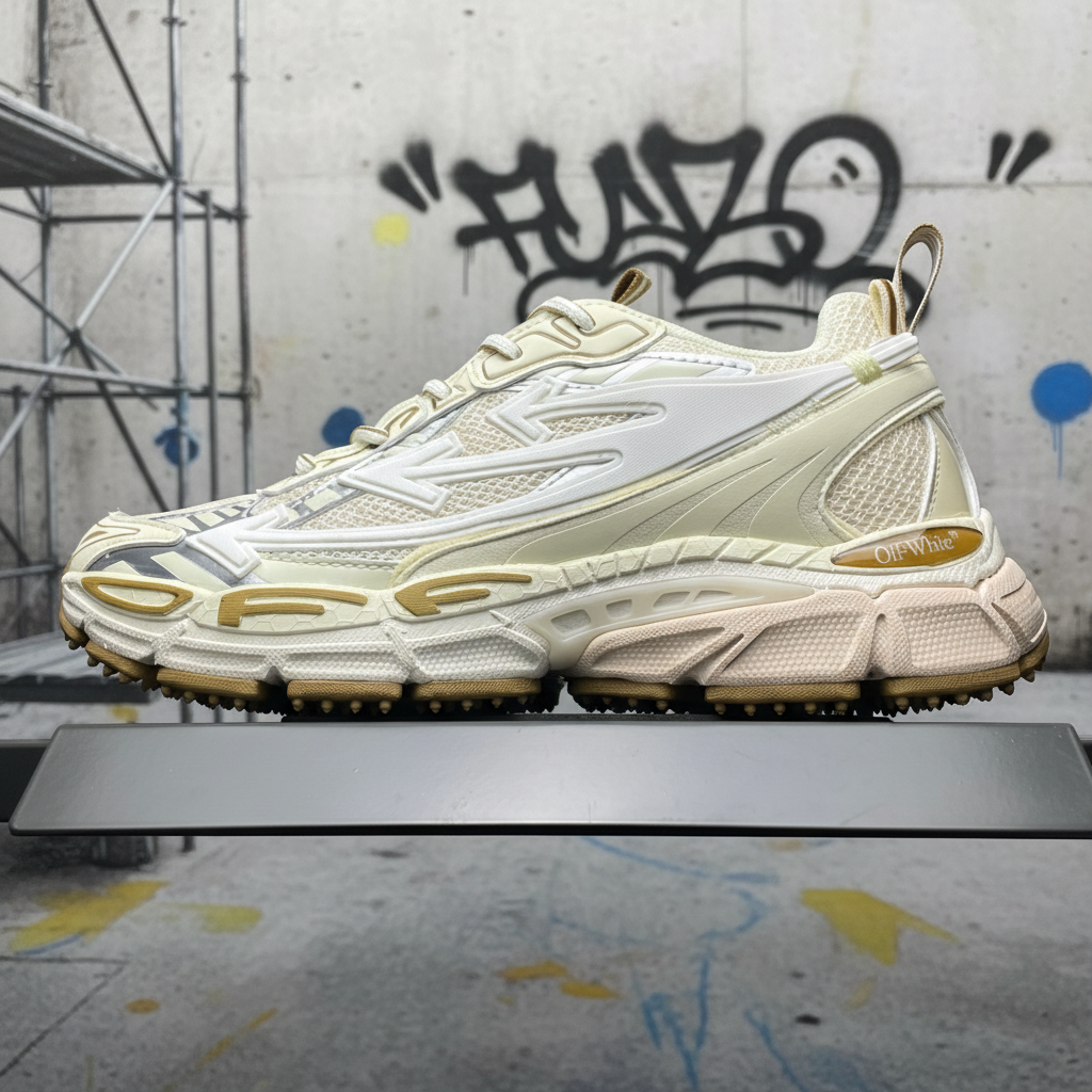 Off-White stylish beige mesh sneakers with chunky sole, breathable design, and premium details for streetwear and casual fashion.