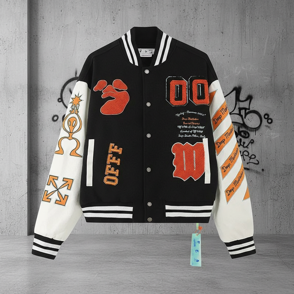 Off-White Varsity Jacket Black White, Streetwear Bomber with Graphic Patches, Trendy Casual Outerwear for Men and Women