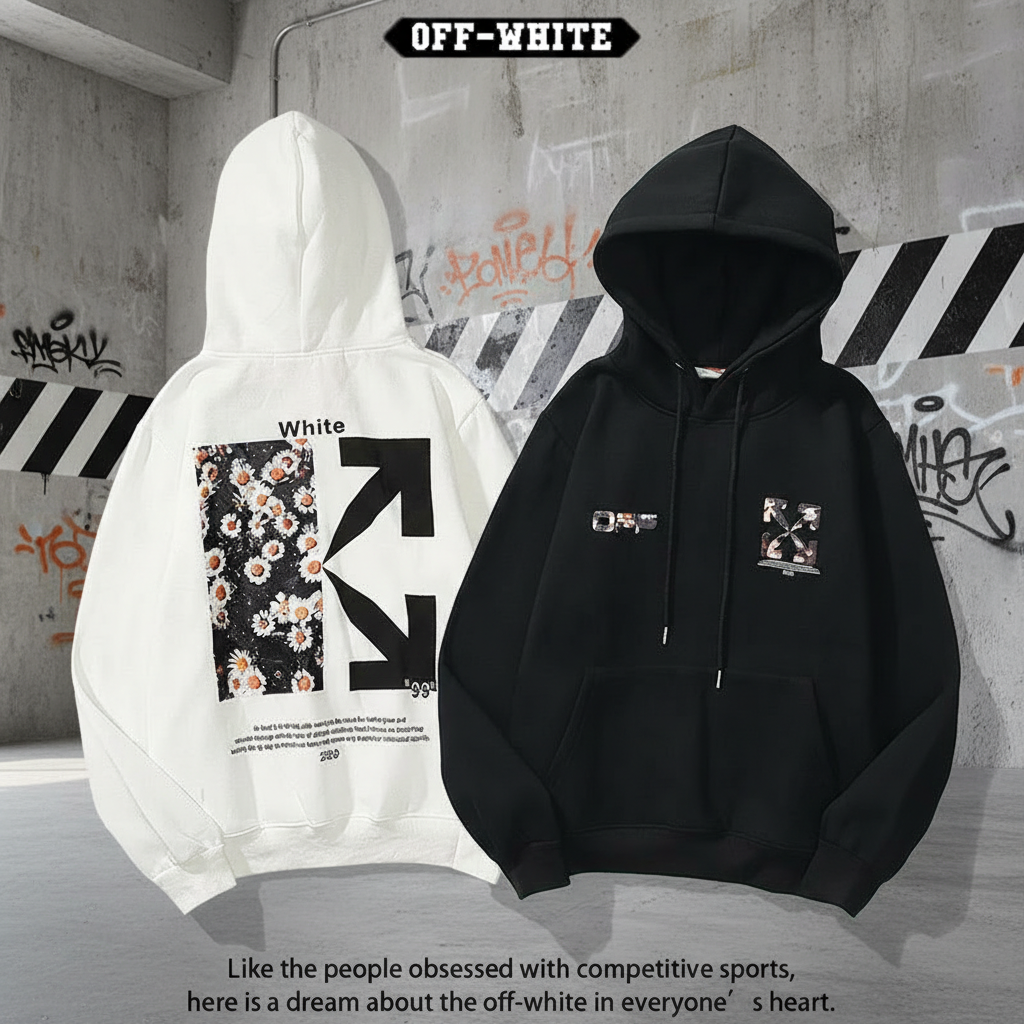 Off-White hoodies with floral and arrow prints, blending streetwear style and sporty inspiration, a must-have for fashion lovers seeking iconic design and comfort.