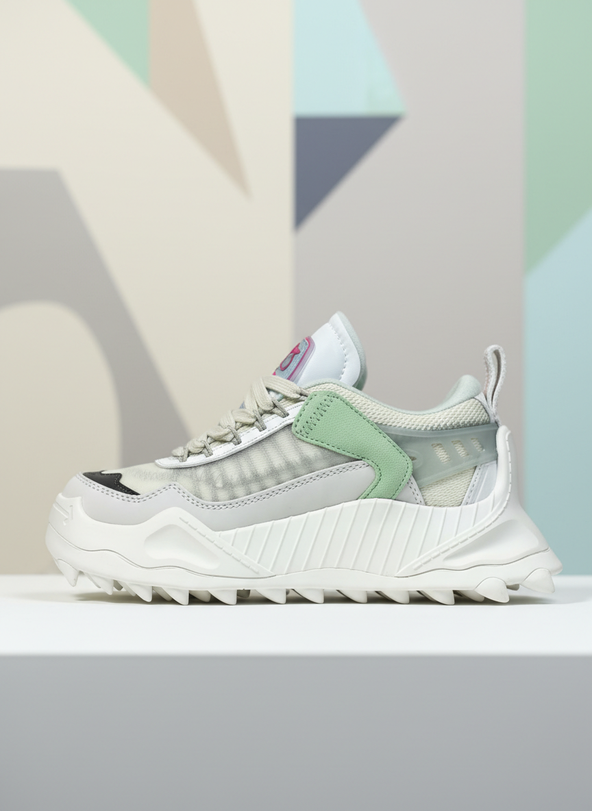 Off-White stylish chunky sole sneakers with mesh and leather panels, green suede accents, and rugged traction outsole for streetwear and casual comfort.