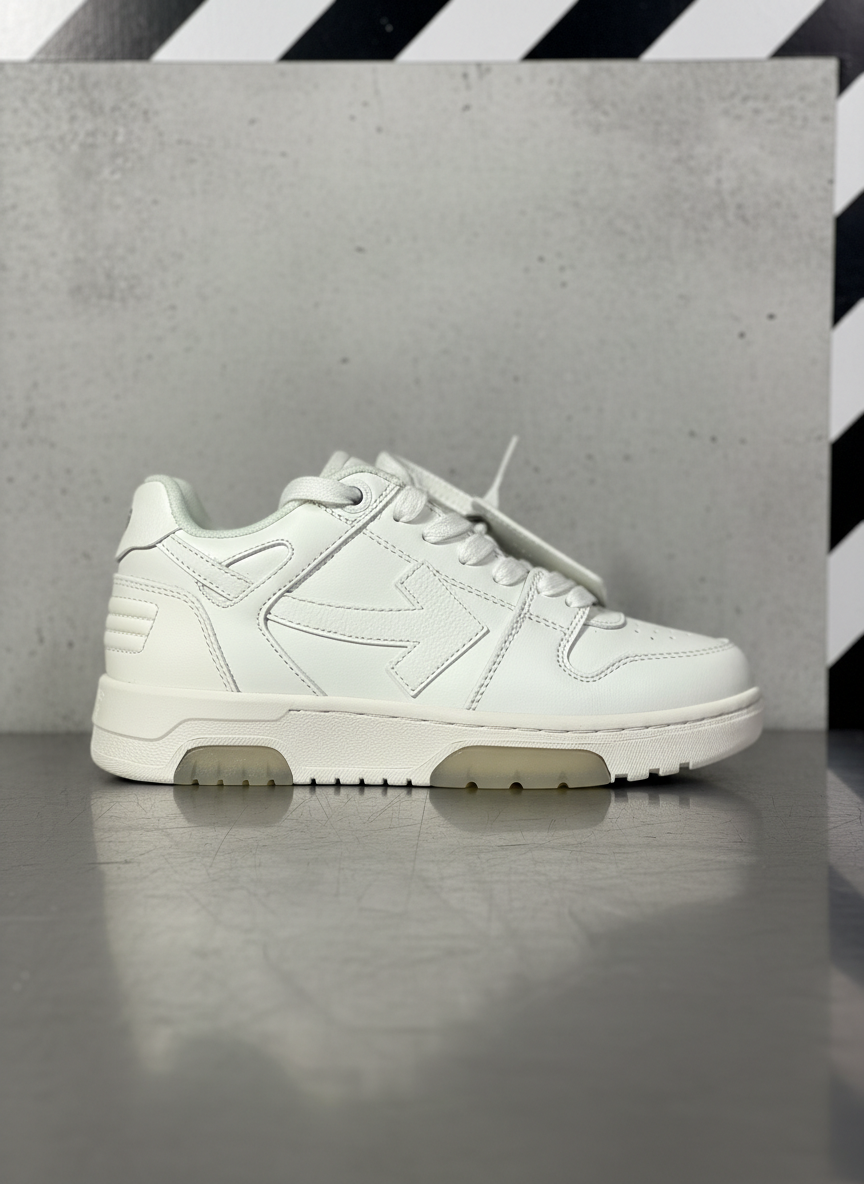 Off-White low-top leather sneakers in classic white, featuring signature arrow detail, durable rubber sole, and modern streetwear style for everyday comfort.