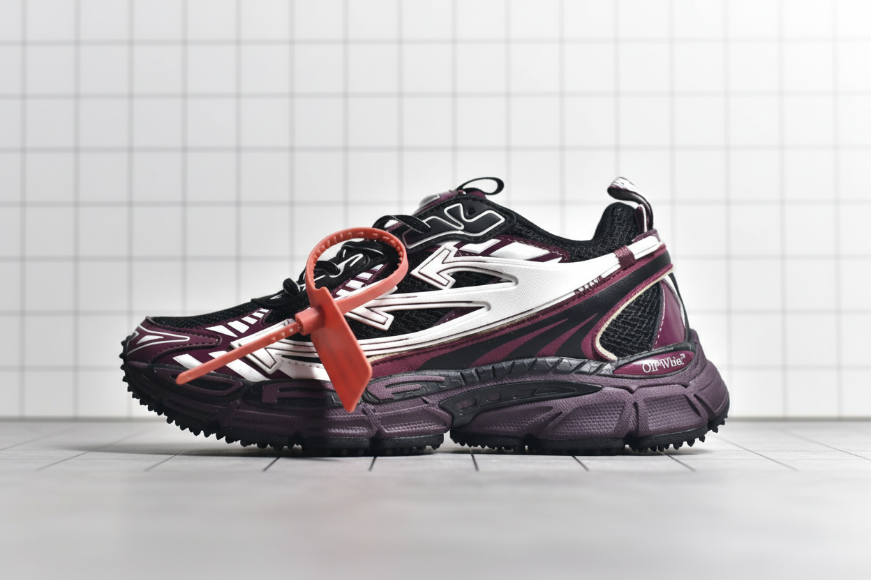 Off-White sneakers with a bold burgundy, black, and white design, breathable mesh, and chunky sole for ultimate streetwear style and all-day comfort.