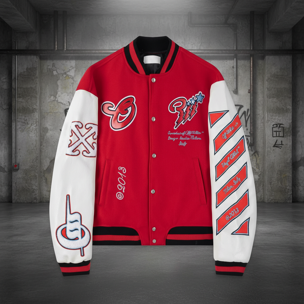 Off-White Red Varsity Jacket with White Sleeves, Bold Embroidery, Premium Wool Blend, Streetwear Style, Designer Outerwear for Men and Women.