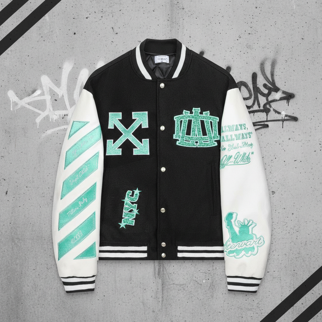 Off-White varsity jacket with iconic arrow and stripe motifs, black wool body, white leather sleeves, and vibrant green embroidery for a bold streetwear look.