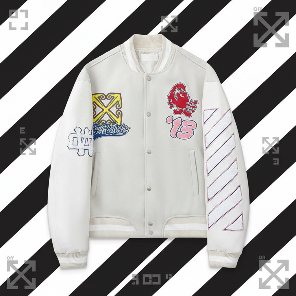 Off-White varsity jacket with embroidered patches, white sleeves, striped cuffs, and bold graphic details for a stylish streetwear look.