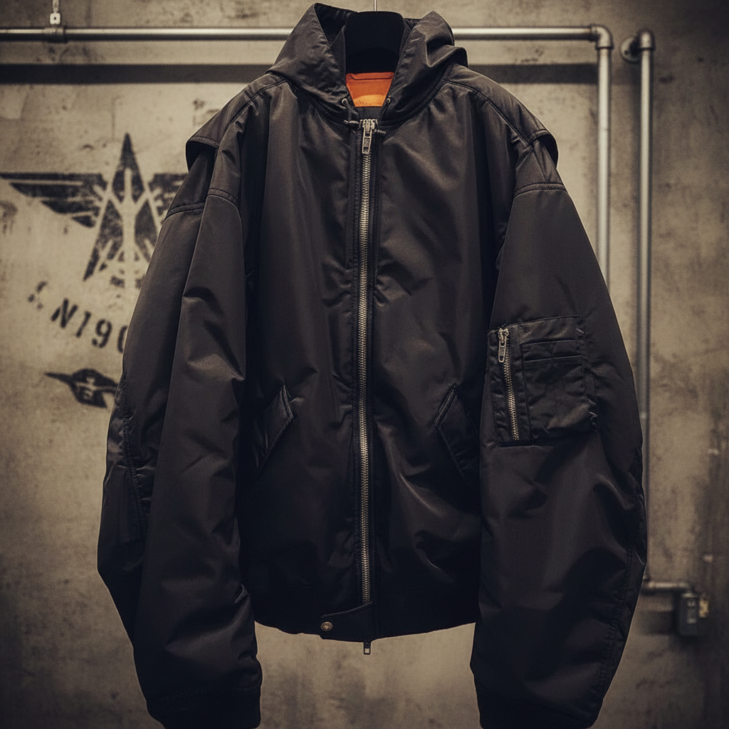 Brand Black Hooded Oversized Bomber Jacket for Men, Warm Winter Outerwear with Front Zipper and Utility Sleeve Pocket, Streetwear Style