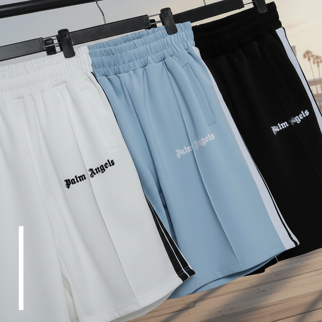 Palm Angels men’s casual track pants with side stripes, elastic waist, and logo print, available in white, blue, and black for sporty streetwear style.