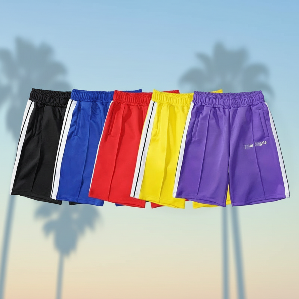 Palm Angels men’s sporty shorts with side stripes, elastic waist, and vibrant colors, perfect for casual wear, street style, and summer comfort.