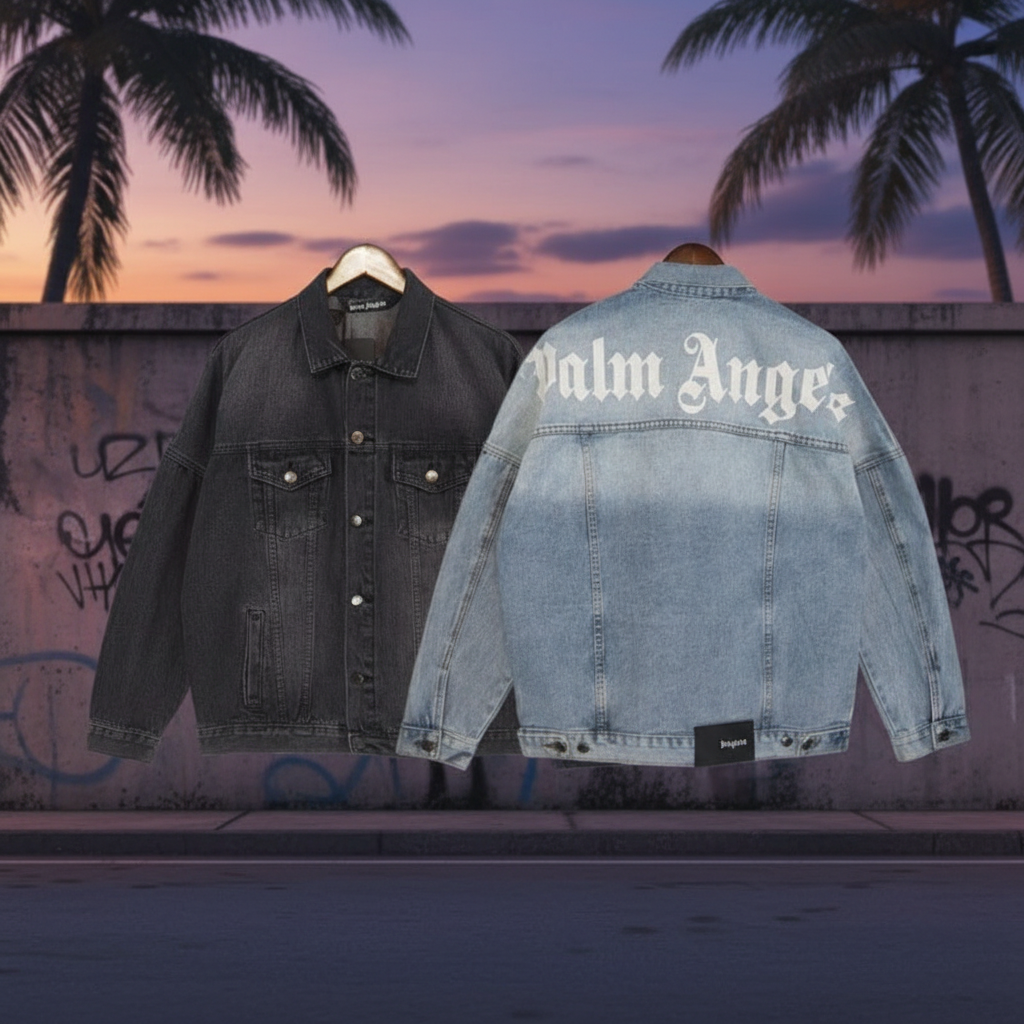 Palm Angels denim jackets, stylish streetwear outerwear in black and blue wash, featuring bold logo print, premium quality for casual and trendy looks.