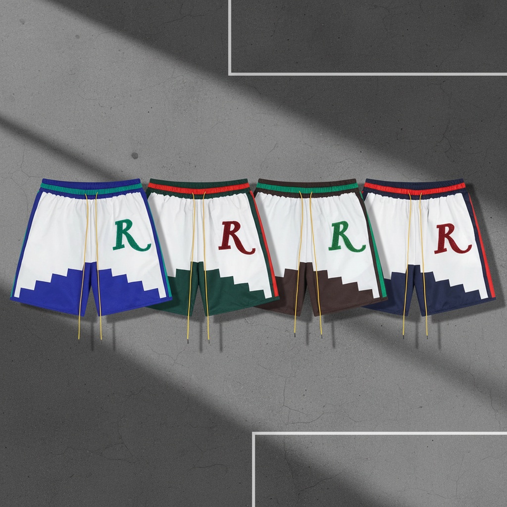 PantsRHude men’s colorblock sports shorts with bold R logo, elastic waist, drawstring, breathable fabric, perfect for casual wear, gym, or street style.