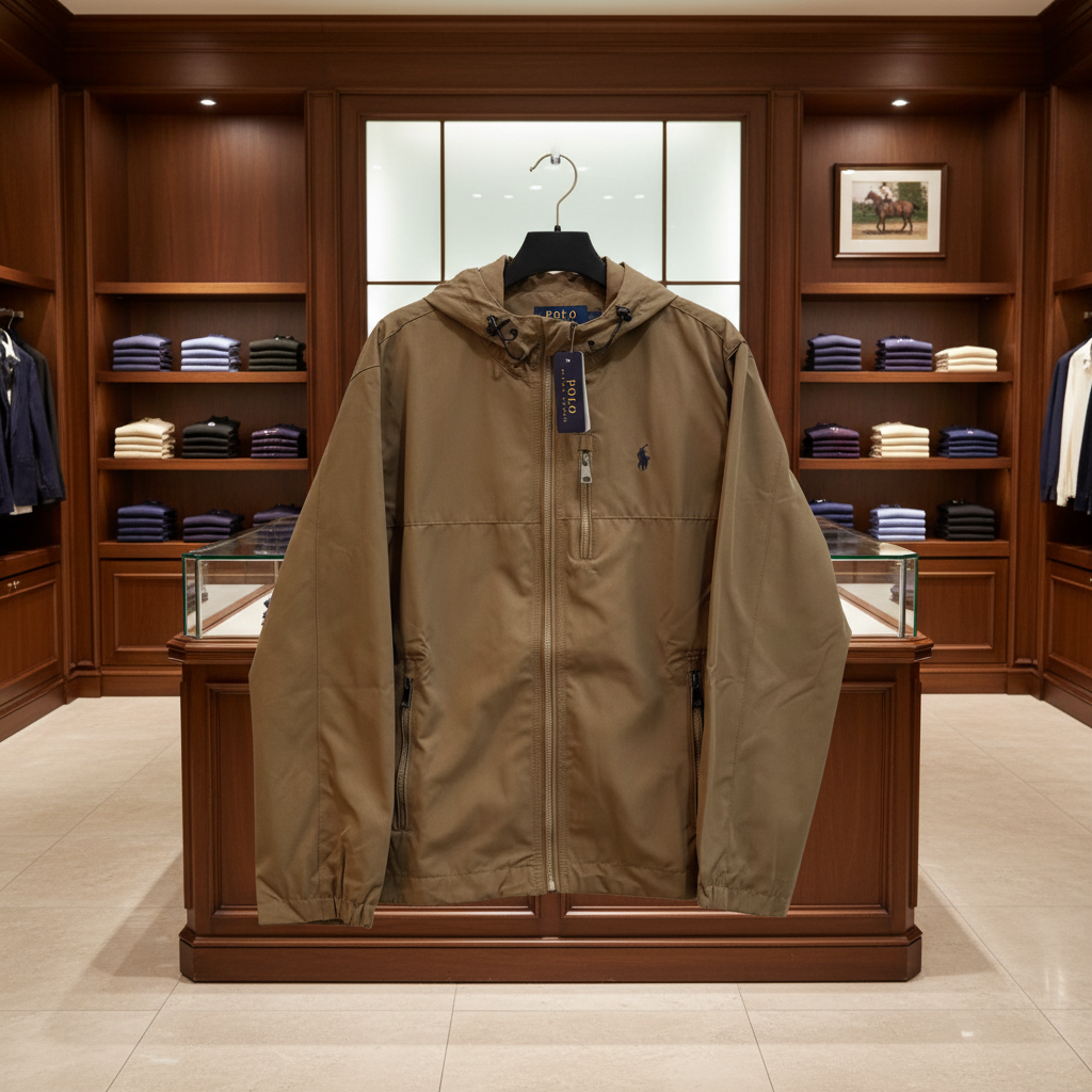 Ralph Lauren men’s lightweight hooded jacket, water-resistant, zip-up design with pockets, perfect for outdoor and casual wear in all seasons.