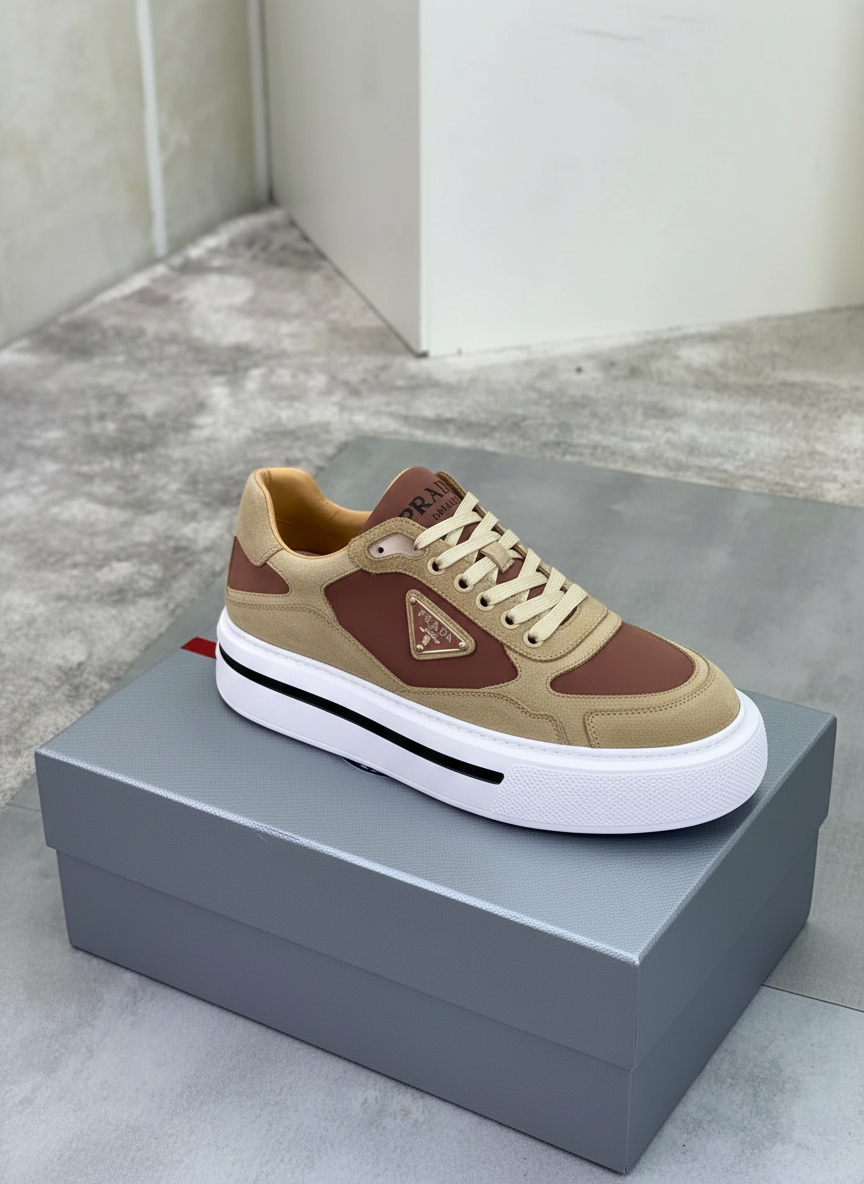 Prada men’s suede and leather sneakers, stylish beige and brown design with thick white sole, perfect for casual and streetwear fashion.