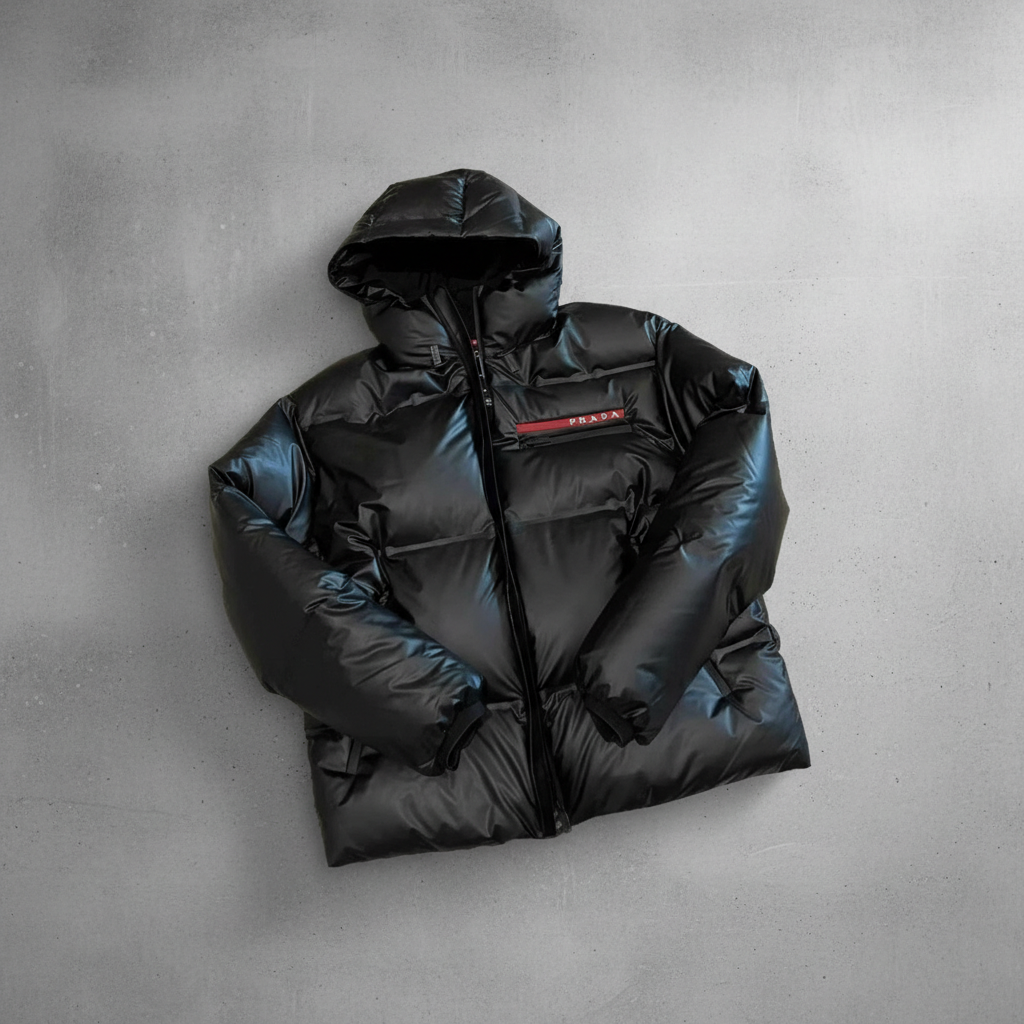 Prada Black Puffer Jacket with Hood, Warm Winter Outerwear, Stylish Quilted Coat for Cold Weather, Luxury Fashion for Men and Women