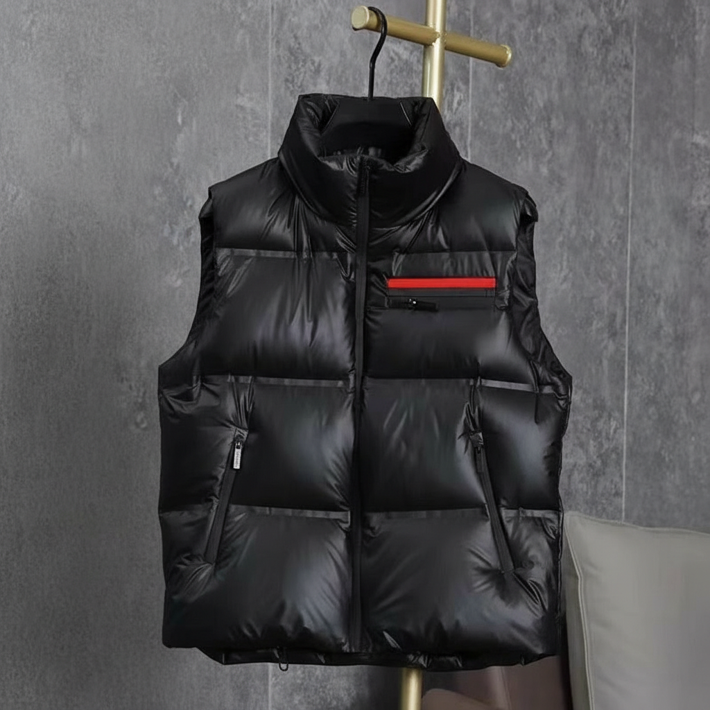 Prada Men’s Black Puffer Vest with High Collar, Lightweight Warm Down, Stylish Red Accent Zip Pocket, Winter Outdoor Fashion