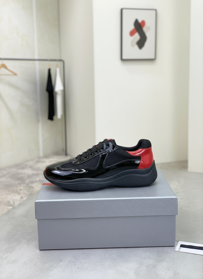 Prada men’s black and red leather sneakers, stylish lace-up design with glossy finish, lightweight sole for comfort, perfect for casual and streetwear fashion.