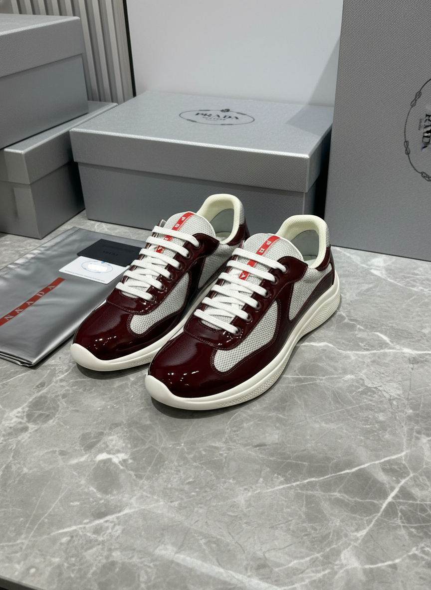 Prada men’s sneakers in burgundy leather and white mesh, featuring lace-up design, comfortable sole, and luxury casual style perfect for fashion-forward everyday wear.