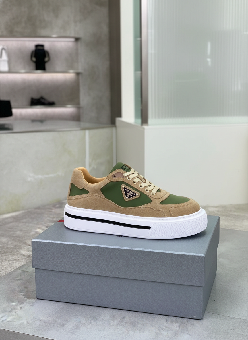 Prada men’s casual sneakers in green and beige suede with chunky white sole, stylish design, perfect for streetwear and everyday comfort.