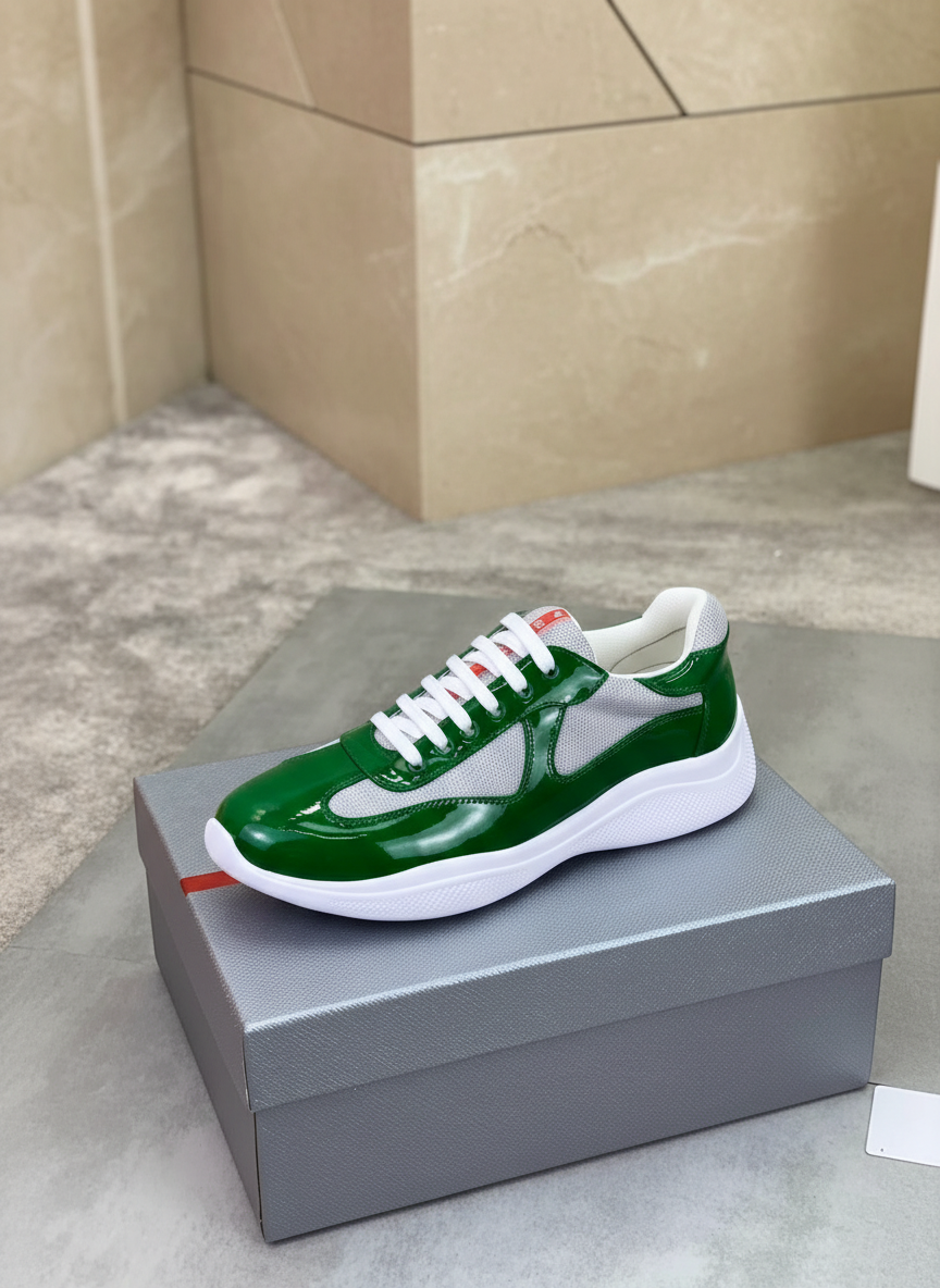 Prada green and white sneakers with sleek patent leather and breathable mesh, stylish lace-up design, perfect for casual wear and trendy street fashion.