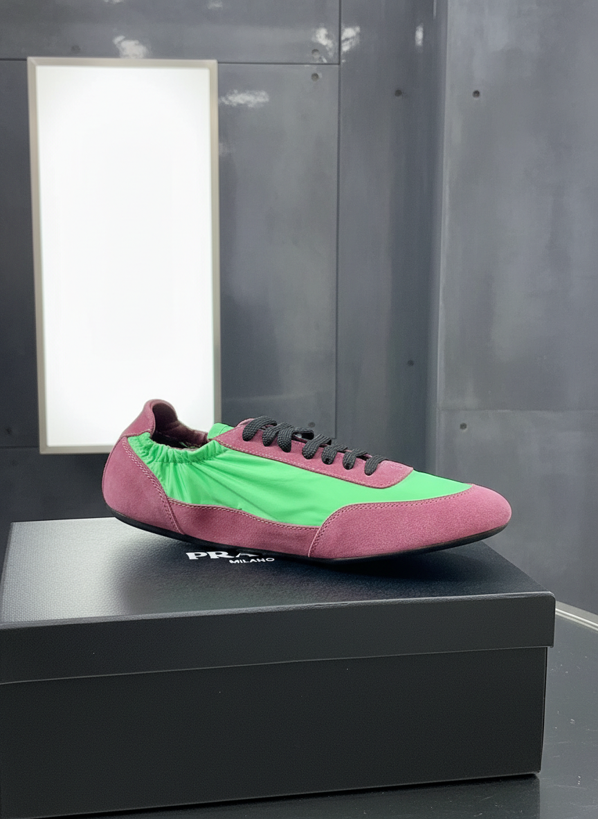 Prada Milano men’s sneakers, green nylon with purple suede, stylish low-top design, lace-up closure, lightweight and comfortable for casual or sport wear.
