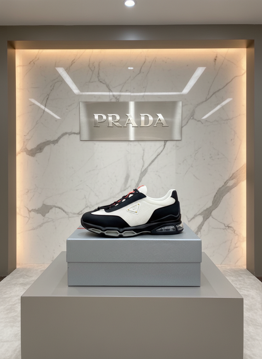 Prada Men’s Fashion Sneakers, Black and White Mesh with Red Accents, Breathable Comfort, Stylish Design, Perfect for Casual or Sport Wear.