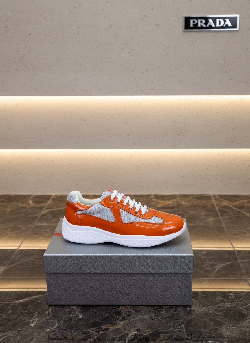 Prada Orange Glossy Leather and Mesh Sneakers, Stylish Lightweight Design for Comfort and Fashion, Perfect for Casual Wear and Sport.