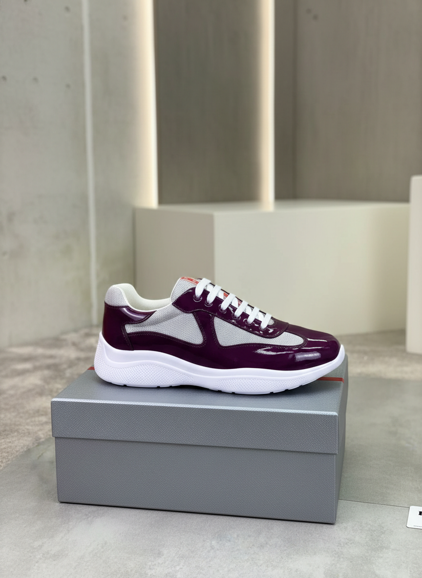 Prada men’s purple patent leather and mesh sneakers, lightweight design, stylish and comfortable for casual wear or sports activities.
